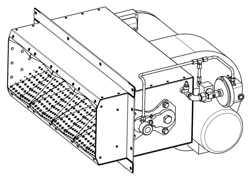 El AH-MA DualBlock, o AHMA-DB, es una versión de tiro forzado del quemador AH-MA con un diseño modular. El quemador viene equipado con una brida para montarlo en la pared o en una placa lista para su inserción en la máquina o conducto de la unidad. El ventilador se puede montar en el interior del horno/conducto o en el exterior. Este quemador se aplica típicamente en conductos en depresión o ligeramente sobrepresionados.